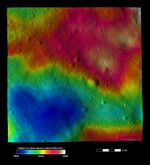 This image is based on a Dawn FC (framing camera) image that is overlain by a color-coded height representation of topography. The topography is calculated from a set of images that were observed from different viewing directions, which allows stereo reconstruction. The various colors correspond to the height of the area. The white and red areas in the top of the image are the highest areas and the blue, heart-shaped area in the bottom of the image is the lowest area. This heart-shaped hollow is roughly 10 kilometers (6 miles) across at its widest point.