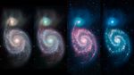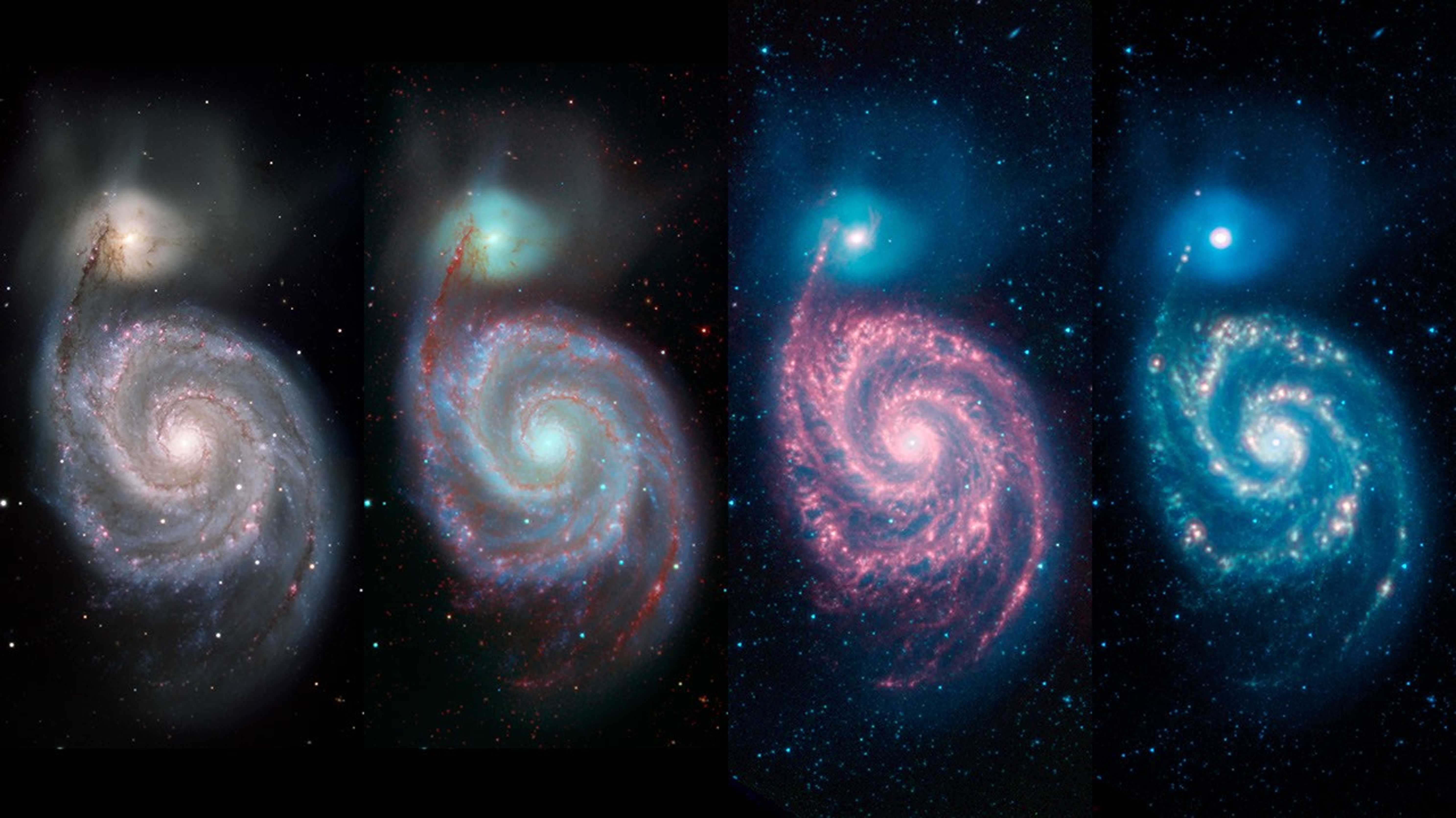 These four panels show the Whirlpool galaxy — which is actually a pair of galaxies also known as Messier 51 and NGC 5194/5195 — and how different wavelengths of light can reveal different features of a cosmic object. Located approximately 23 million light-years away, it resides in the constellation Canes Venatici.