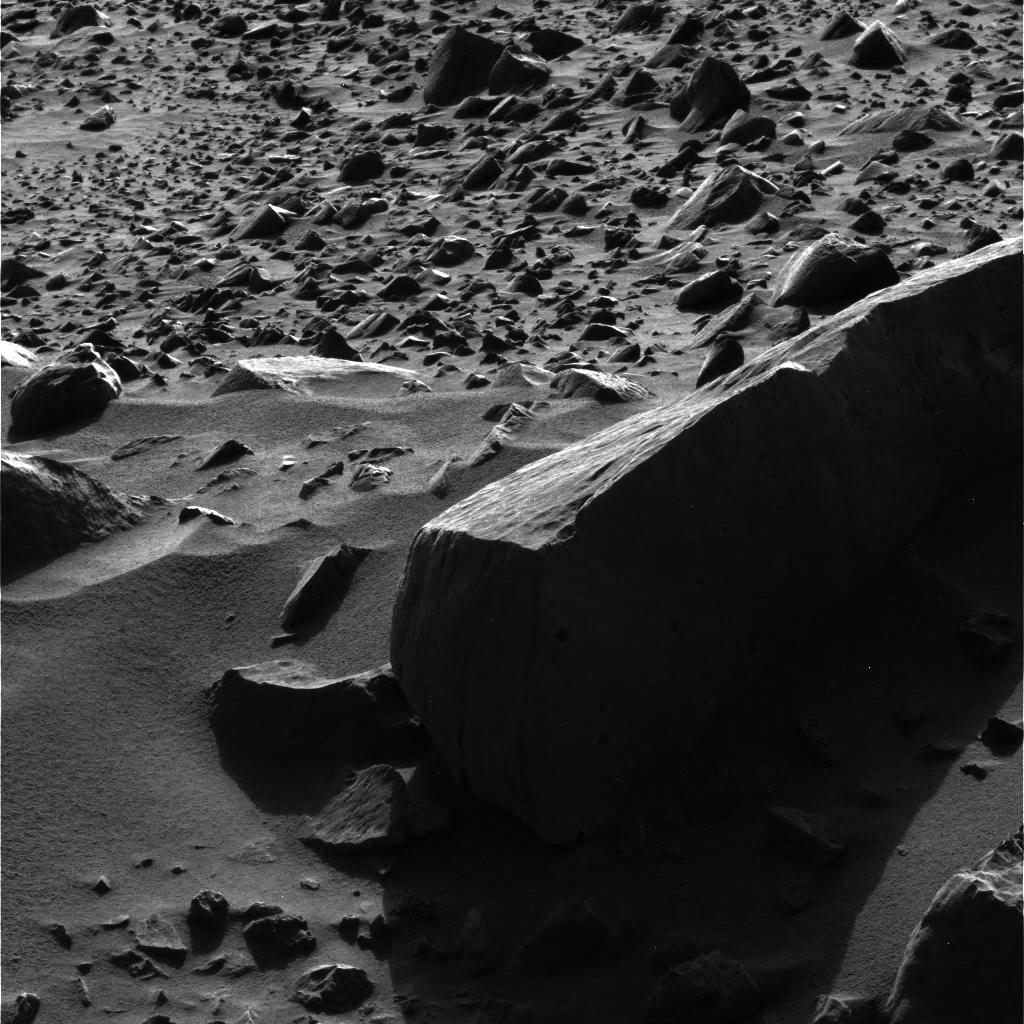 Many smaller rocks can be seen in the background of the image. Some rocks are completely exposed, while others are only peeking out of the surface. Scientists believe that two processes might be at work here: accretion, which occurs when winds deposit material that slowly buries many of the rocks; and deflation, which occurs when surface material is removed by wind, exposing more and more of the rocks.