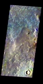 Note: this THEMIS visual image has not been radiometrically nor geometrically calibrated for this preliminary release. An empirical correction has been performed to remove instrumental effects. A linear shift has been applied in the cross-track and down-track direction to approximate spacecraft and planetary motion. Fully calibrated and geometrically projected images will be released through the Planetary Data System in accordance with Project policies at a later time.