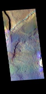 The THEMIS VIS camera contains 5 filters. The data from different filters can be combined in multiple ways to create a false color image. These false color images may reveal subtle variations of the surface not easily identified in a single band image.