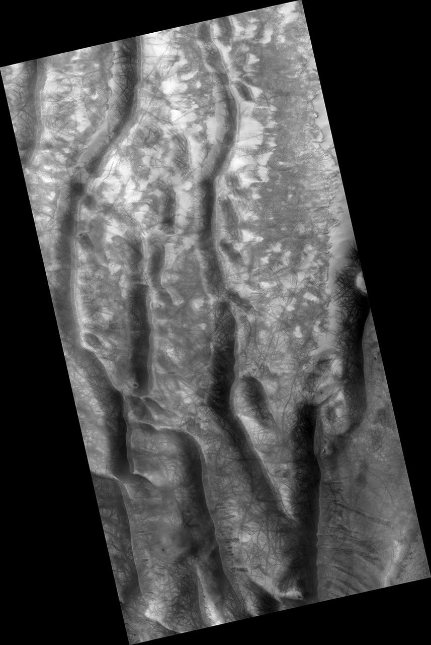 Gully and defrosting activity have been visible here along the edge of a dune field, along with blocks of frost. Observations of the same area help us check for repeat activity, as well as measuring those meter-scale blocks that we've seen prior.