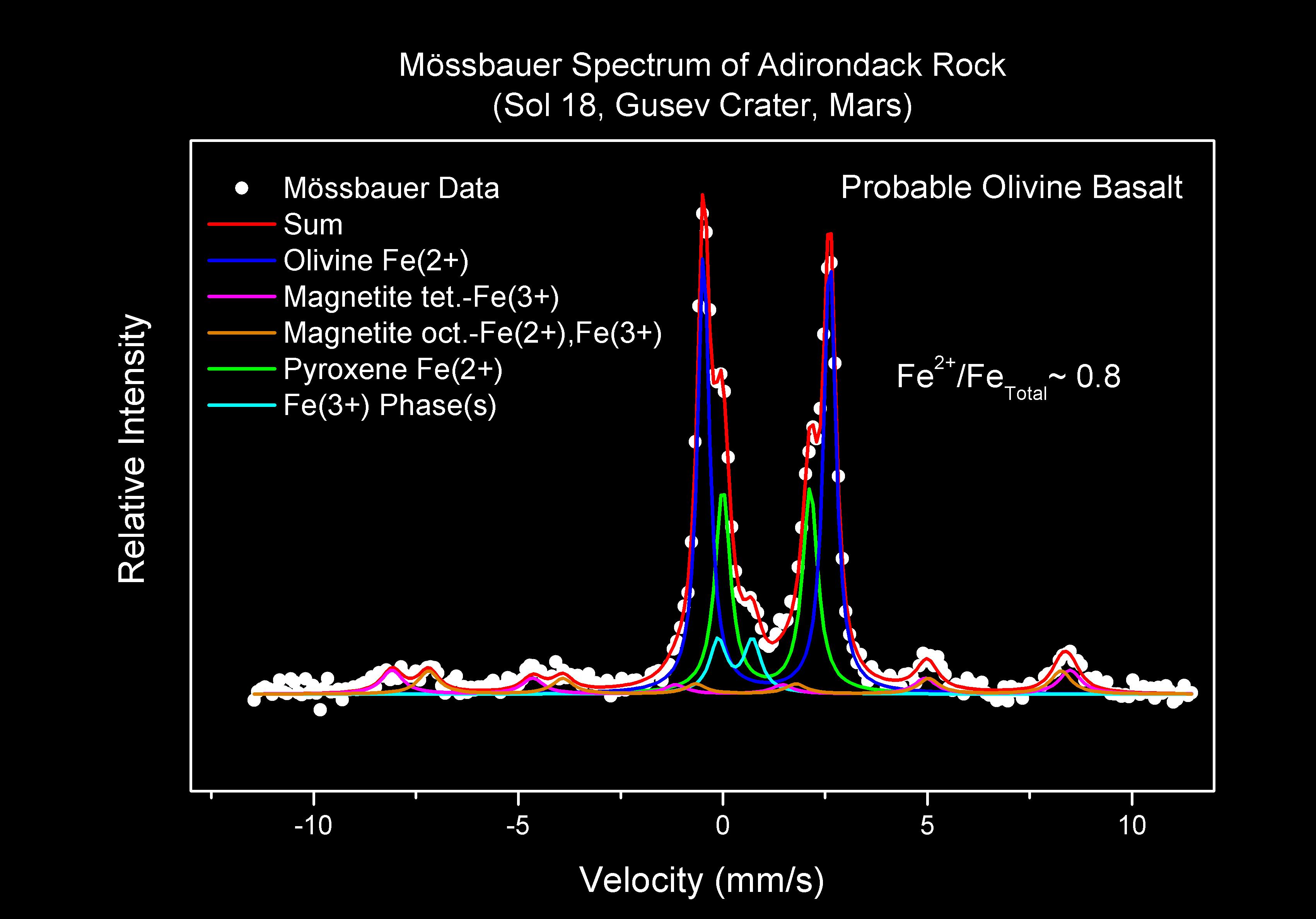 This spectrum - the first taken of a rock on another planet - reveals the different iron-containing minerals that makeup the martian rock dubbed Adirondack. It shows that Adirondack is a type of volcanic rock known as basalt. Specifically, the rock is what is called olivine basalt because in addition to magnetite and pyroxene, two key ingredients of basalt, it contains a mineral called olivine. This data was acquired by Spirit's Moessbauer spectrometer before the rover developed communication problems with Earth on the 18th martian day, or sol, of its mission.