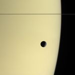 Tethys floats before the massive, golden-hued globe of Saturn in this natural color view. The thin, dark line of the rings curves around the horizon at top.