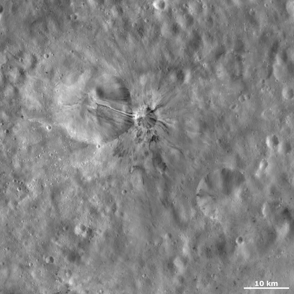 This Dawn framing camera (FC) image of Vesta shows Aelia crater, which is the small crater roughly in the center of the image. There is a larger, more degraded crater to the left of Aelia. Dark and bright material crops out from Aelia's rim and slumps towards its center and also extends in rays outside of the crater's rim for up to approximately 7 kilometers (4.4 miles). This dark and bright material is concentrated into bands, each of which is less than 1 kilometer (0.6 mile) in width. One particularly striking band originates on the left side of Aelia's rim and then slumps down into the neighboring, degraded crater. This band consists of a central band of bright material that is flanked by bands of dark material on either side.