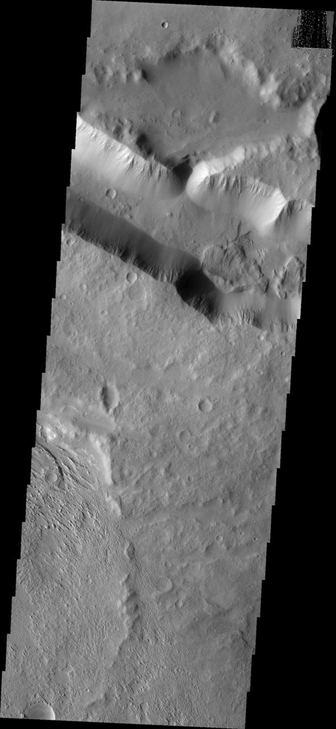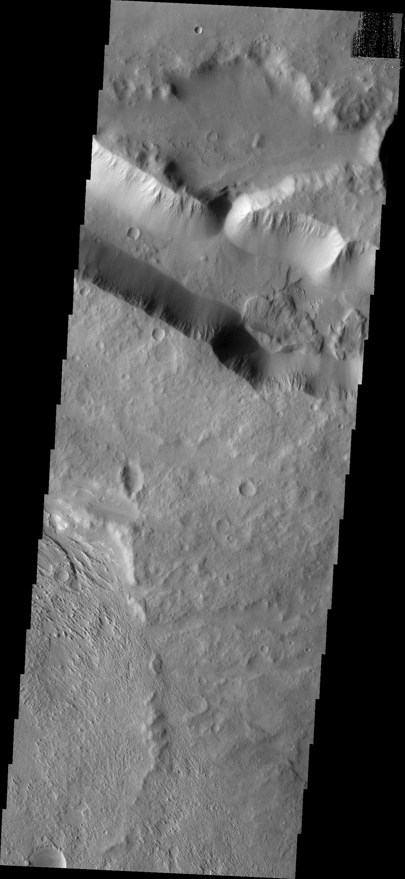 Note: this THEMIS visual image has not been radiometrically nor geometrically calibrated for this preliminary release. An empirical correction has been performed to remove instrumental effects. A linear shift has been applied in the cross-track and down-track direction to approximate spacecraft and planetary motion. Fully calibrated and geometrically projected images will be released through the Planetary Data System in accordance with Project policies at a later time.