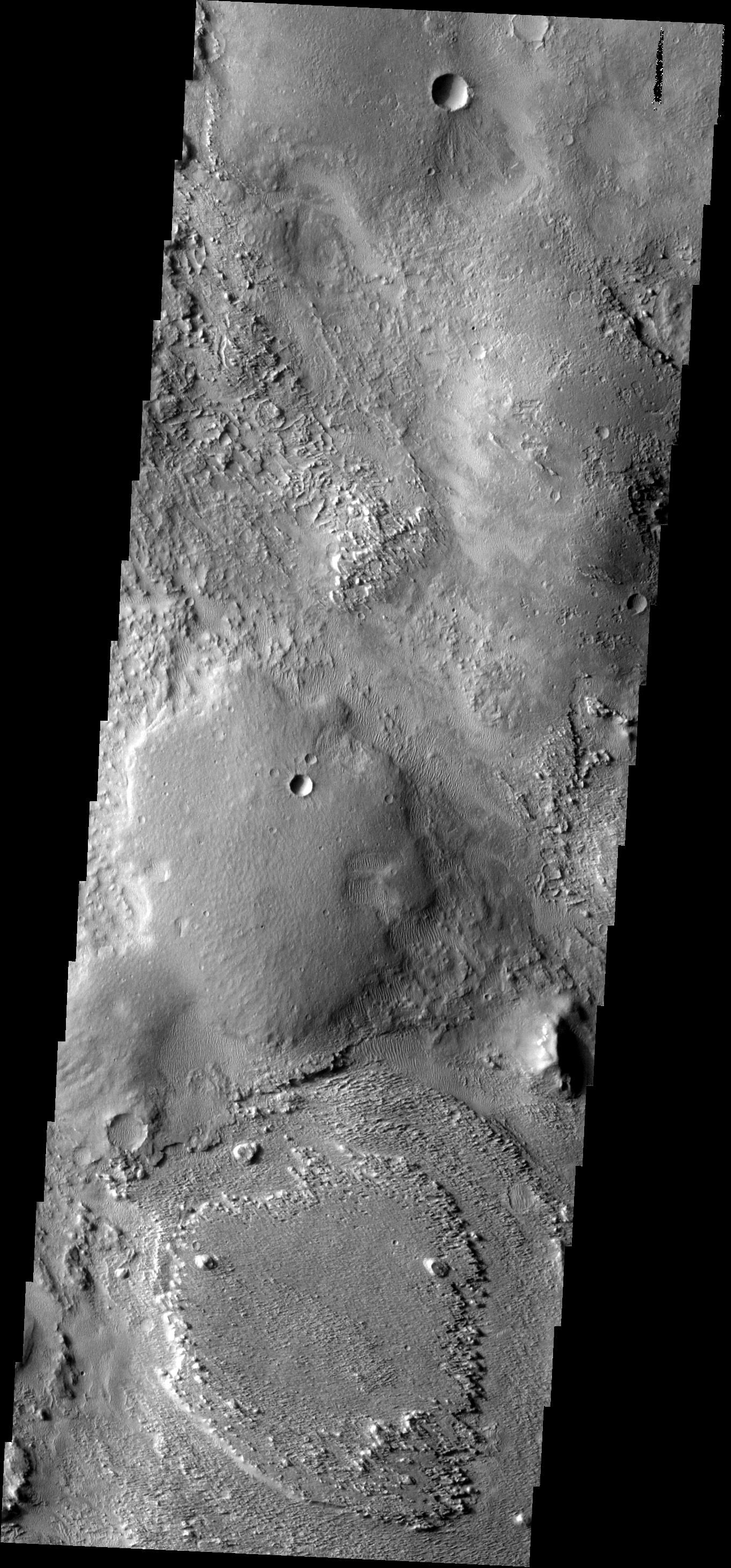 Note: this THEMIS visual image has not been radiometrically nor geometrically calibrated for this preliminary release. An empirical correction has been performed to remove instrumental effects. A linear shift has been applied in the cross-track and down-track direction to approximate spacecraft and planetary motion. Fully calibrated and geometrically projected images will be released through the Planetary Data System in accordance with Project policies at a later time.