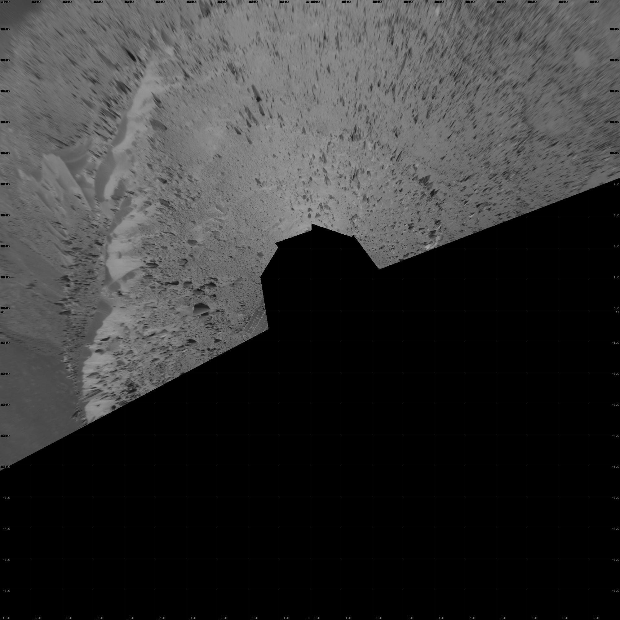 The scene is a mosaic of images that Spirit took with the navigation camera on the rover's 635th Martian day, or sol, (Oct. 16, 2005) of exploration of Gusev Crater on Mars. This view is presented in a vertical projection with geometric seam correction.