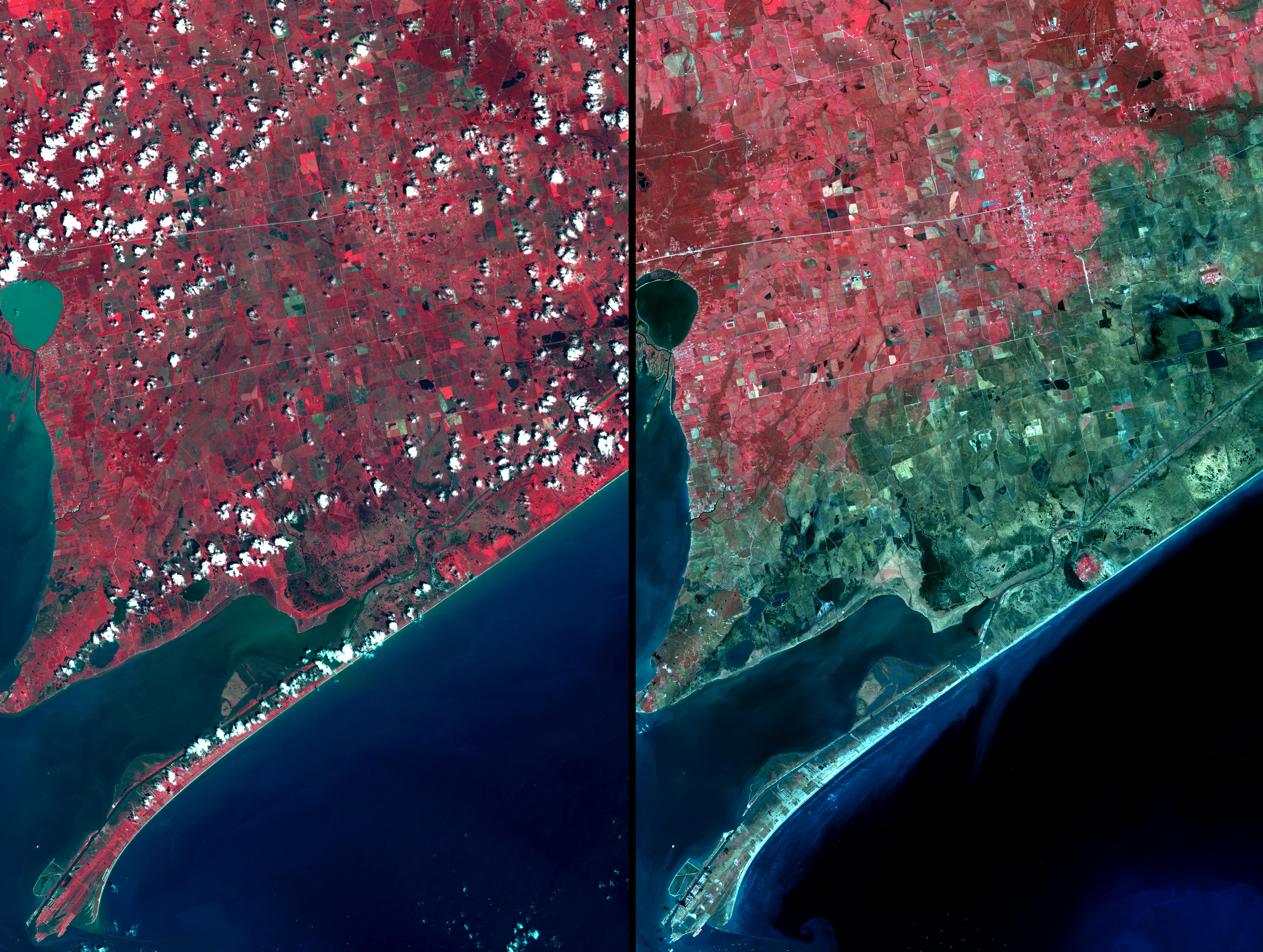 Three weeks after Hurricane Ike came ashore near Galveston, TX, residents returned to find their houses in ruins. From the coast to over 15 km inland, salt water saturated the soil as a result of the 7m storm surge pushed ashore by the force of the hurricane. The right image was acquired on September 28; the left image was acquired August 15, 2006. Vegetation is displayed in red, and inundated areas are in blue-green. Within the inundated area are several small "red islands" of high ground where salt domes raised the level of the land, and protected the vegetation.