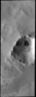 Today's VIS image is of an unnamed crater near the south pole. This image was taken in the late afternoon, and the low sun angle created shadows cast by the crater rim.