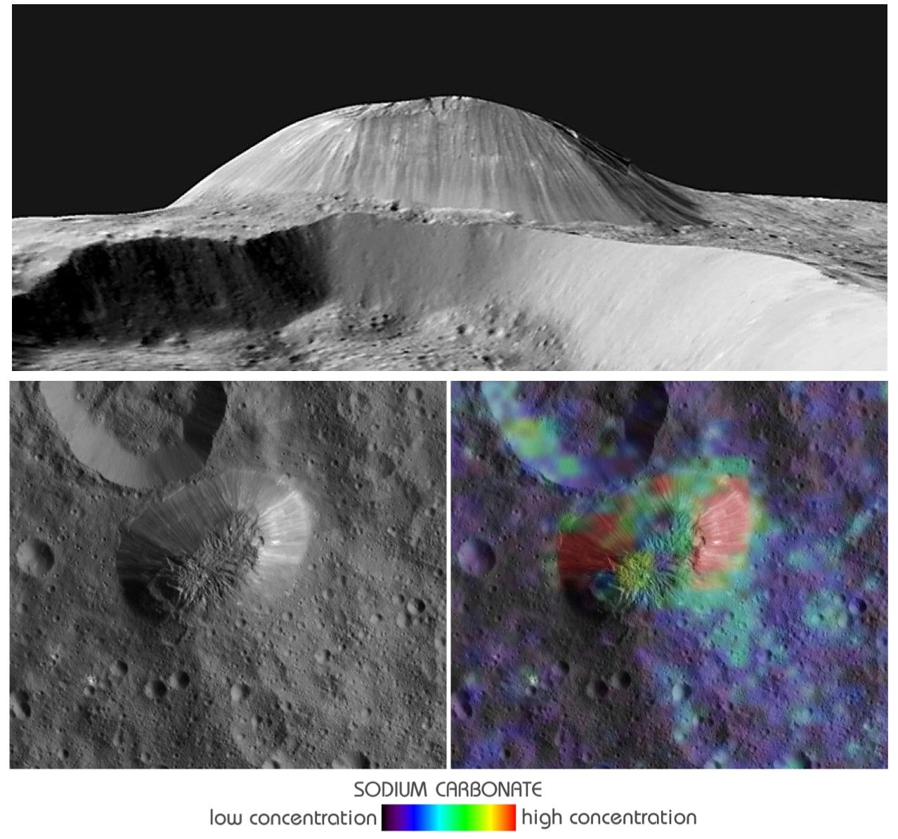 The top and lower left images were collected by Dawn's framing camera. The top image is a 3D view reconstructed with the help of topography data.