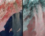 In this image pair from the Multi-angle Imaging SpectroRadiometer (MISR), a false-color nadir image (left) highlights the burnt areas, while a 3-D stereo anaglyph image (right) accentuates the dust and indicates the relative height above the surface of the dust and ash blown aloft from the hills that were burnt. The two images cover the same area and have been oriented with north toward the left in order to facilitate stereo viewing. Burnt areas appear in brown hues and highly vegetated areas appear red in the left-hand view, which was constructed with near-infrared, green and blue band data from MISR's vertical-viewing (nadir) camera. The accentuation of the dust and ash plumes in the anaglyph is due to the use of imagery from two of MISR's oblique-viewing cameras. Here, red band data from MISR's 70° forward-viewing and 60° forward-viewing cameras are displayed as red and green/blue, respectively. The anaglyph makes it possible to see height variations of the surface terrain, dust and ash plumes, and a few high clouds, but height variations can only be observed in 3-D with the aid of red/blue glasses. Information on ordering glasses can be found at https://photojournal.jpl.nasa.gov/Help/VendorList.html#Glasses.