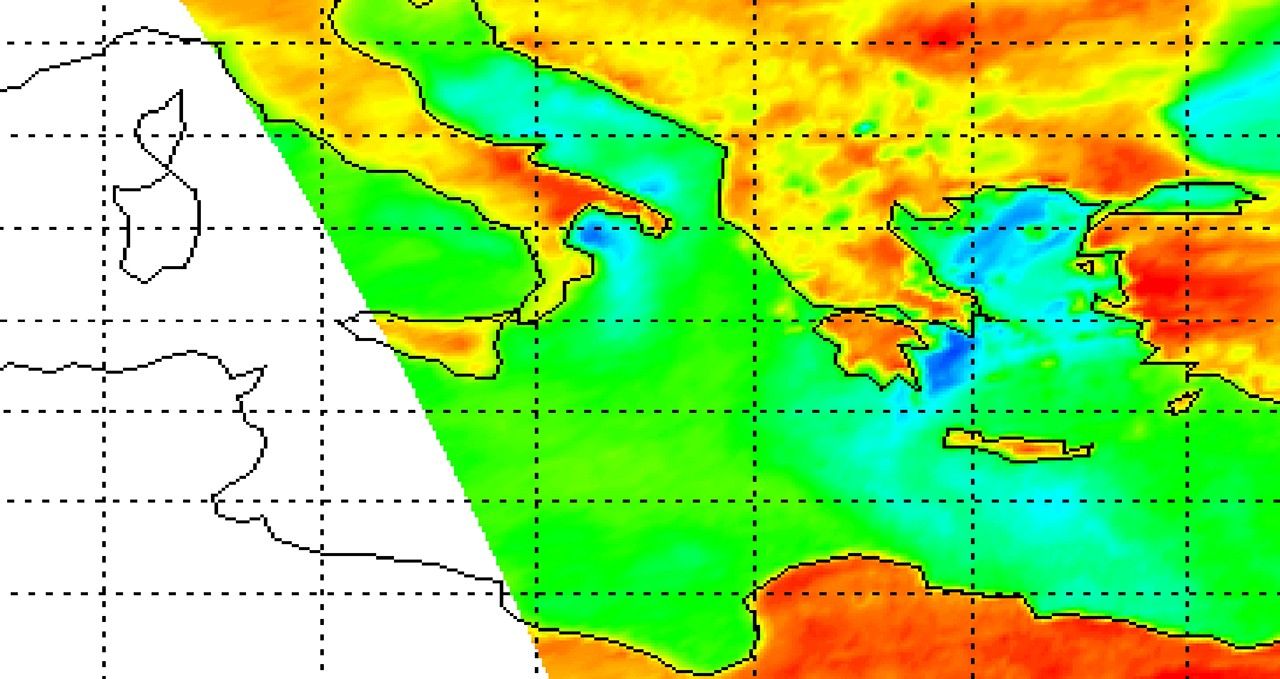The 150 gigahertz channel from the Humidity Sounder for Brazil instrument (figure 2) is sensitive to moisture, ice particles and precipitation. The dry land temperature is comparable to the 11 micrometer temperatures, but over ocean this channel measures the temperature of moisture in the mid troposphere. The cold, blue areas off Sicily and in the Aegean Sea represent unusually dry areas over the ocean. There, clouds appear as green filaments--likely areas of precipitation.