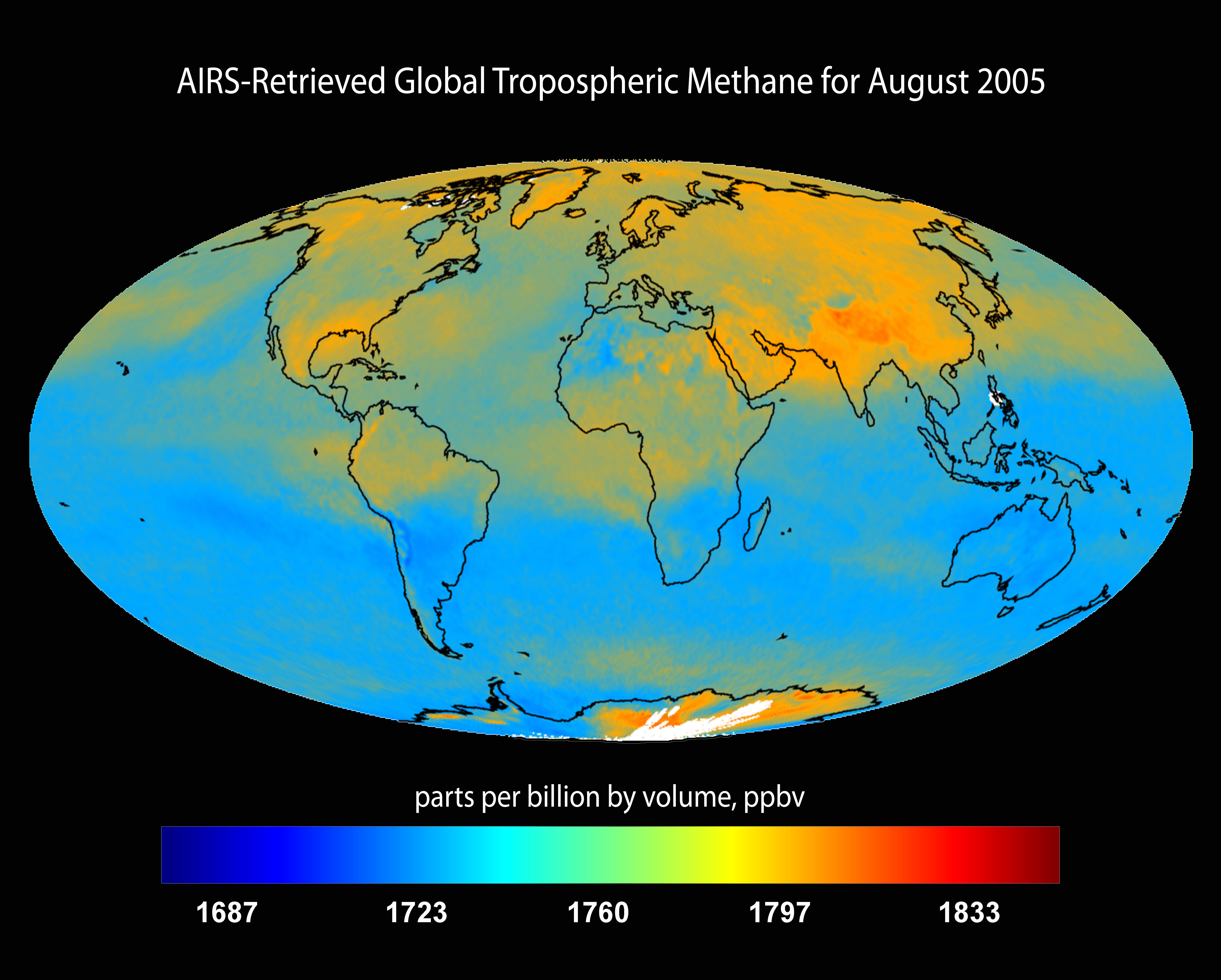 This image is the AIRS-retrieved global tropospheric methane for August 2005. This AIRS research product will aid in the identification of natural and anthropogenic sources of this greenhouse gas, its seasonal and multi-year variation and its transport around the globe at several altitudes in the troposphere.