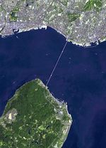 The Akashi Kaikyo Bridge in Japan has the longest central span of any suspension bridge in the world at 1991 m. The total length of the bridge is 3911 m. It links the city of Kobe on the mainland of Honshu to Iwaya on Awaji Island, crossing the busy Akashi Strait. The image was acquired April 26, 2014, covers an area of 8.1 by 11.2 km, and is located at 34.6 degrees north, 135 degrees east.