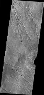 Note: this THEMIS visual image has not been radiometrically nor geometrically calibrated for this preliminary release. An empirical correction has been performed to remove instrumental effects. A linear shift has been applied in the cross-track and down-track direction to approximate spacecraft and planetary motion. Fully calibrated and geometrically projected images will be released through the Planetary Data System in accordance with Project policies at a later time.