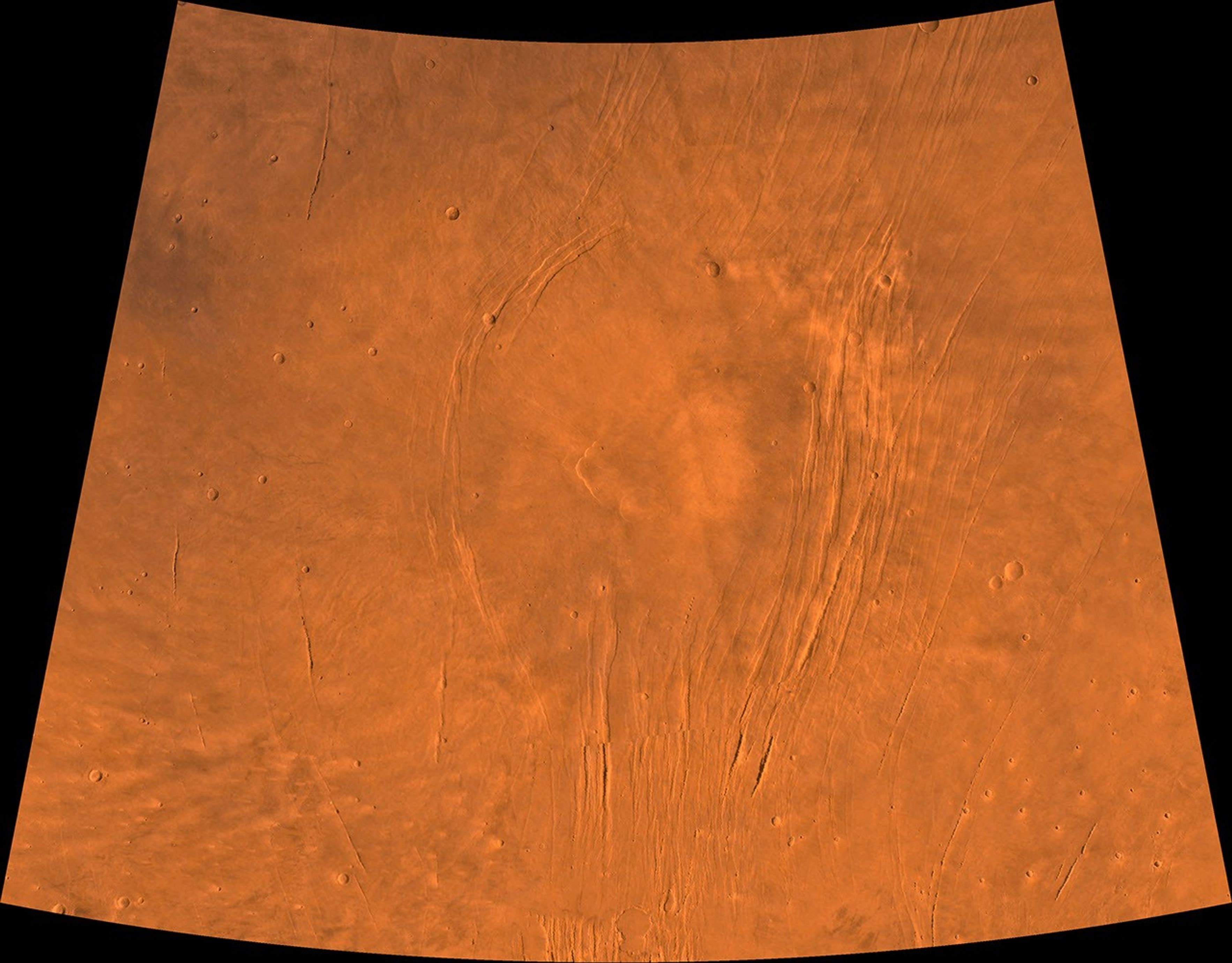 A color image of the Alba Patera region of Mars; north toward top. The scene shows a central circular depression surrounded by splays of fractures, named Alba Fossae (west of Alba Patera) and Tantalus Fossae (east of Alba Patera). A patera (Latin for shallow dish or saucer) is a volcano of broad areal extent with little vertical relief; a fossa is a linear depression.