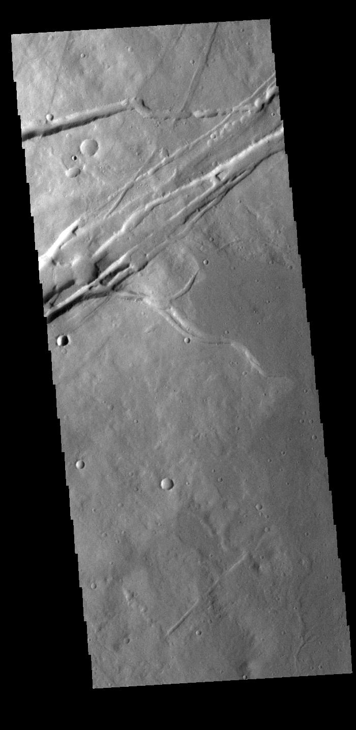 This VIS image shows part of Albor Fossae. These fossae (graben) are located on the southeastern flank of Albor Tholus, one of the volcanoes of the Elysium volcanic complex.