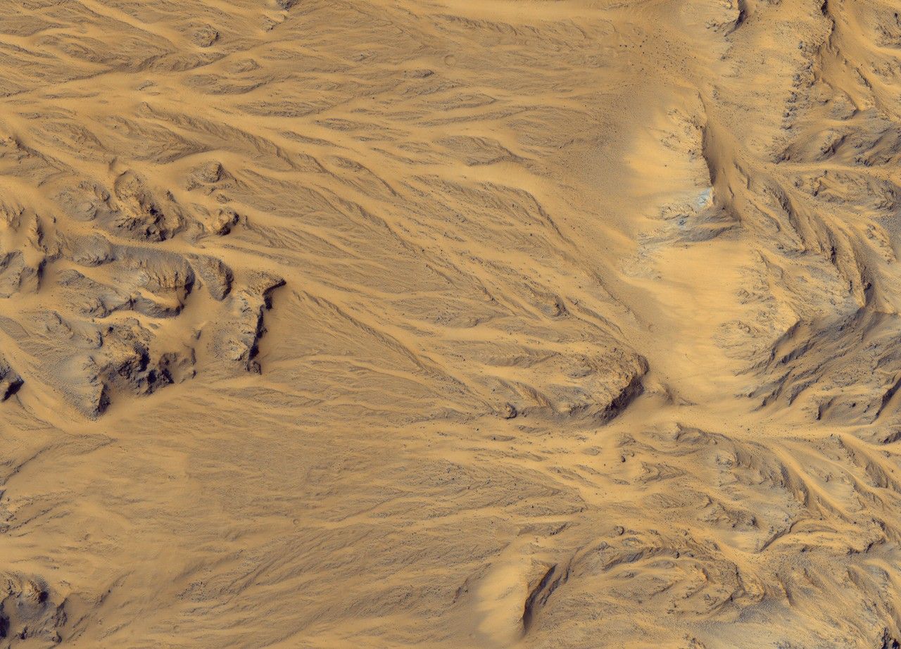 This HiRISE image at up to 29 cm/pixel scale supports the alluvial fan interpretation, in particular by showing that the sizes of the largest rocks decrease away from the mouths of the fans. Aptly-named Mojave crater in the Xanthe Terra region has alluvial fans that look remarkably similar to landforms in the Mojave Desert of southeastern California and portions of Nevada and Arizona. Alluvial fans are fan-shaped deposits of water-transported material (alluvium). They typically form at the base of hills or mountains where there is a marked break, or flattening of slope. They typically deposit big rocks near their mouths (close to the mountains) and smaller rocks at greater distances. Alluvial fans form as a result of heavy desert downpours, typically thundershowers. Because deserts are poorly vegetated, heavy and short-lived downpours create a great deal of erosion and nearby deposition. There are fans inside and around the outsides of Mojave crater on Mars that perfectly match the morphology of alluvial fans on Earth, with the exception of a few small impact craters dotting this Martian landscape. Channels begin at the apex of topographic ridges, consistent with precipitation as the source of water, rather than groundwater. This remarkable landscape was first discovered from Mars Orbital Camera images. Mars researchers have suggested that impact-induced atmospheric precipitation may have created these unique landscapes.