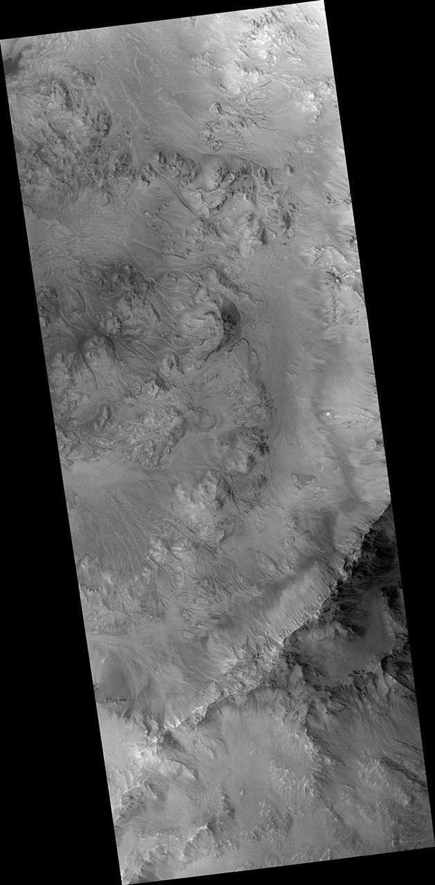 Stereo data from an anaglyph (or 3D) image shows that the landscape in this observation is pervasively eroded, right up to the tops of the ridges, with channels extending down into depositional fans much like alluvial fans in the Mojave Desert.