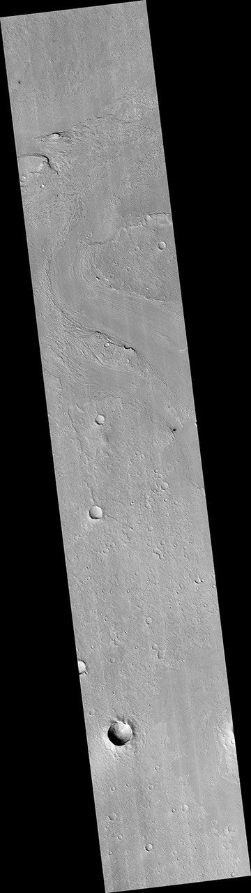 The lava appears to have flowed smoothly around obstructions, almost like water, forming streamlined islands. In the southern part of this image, a branch of the flow diverts around a small crater, and eventually rejoins the main part of the flow. Irregular-shaped ring structures appear on the northern end and are related to the volcanic activity that formed the flows.