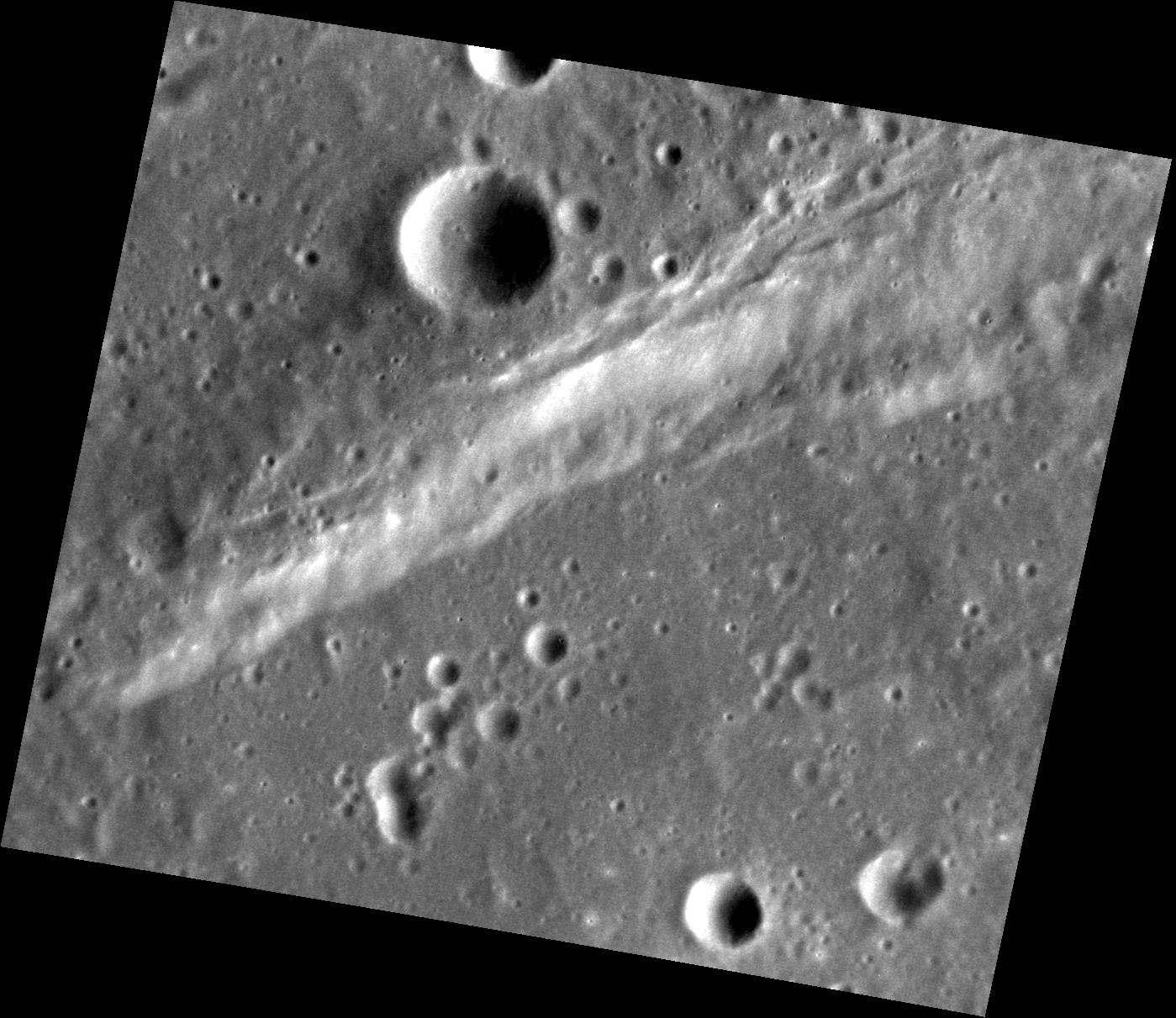 Today's image features several of Mercury's simple craters. The morphology of simple craters is characterized by the crater's distinct bowl shape and crisp rim. The largest simple crater in this view is positioned just above a scarp. Scarps are common topographic features on Mercury that form as one block of the planet's crust is thrusted forward over another block.