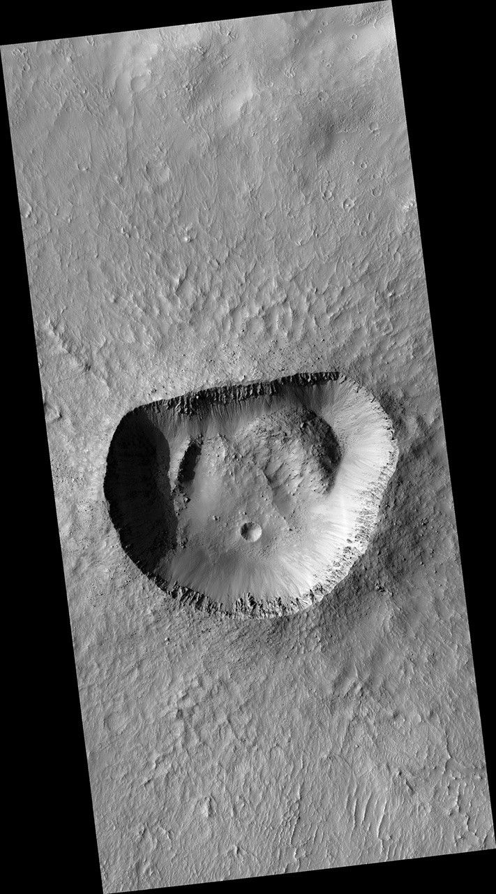 Perhaps some sort of uneven collapse changed the shape of the crater. There are piles of material on the crater's floor, especially in the northwest and northeast corners. If those piles fell down from the rim, why did it happen there and not in other places? This crater is near the size where larger craters start to show wall slumping and terraces, so this type of collapse could be occurring unevenly.