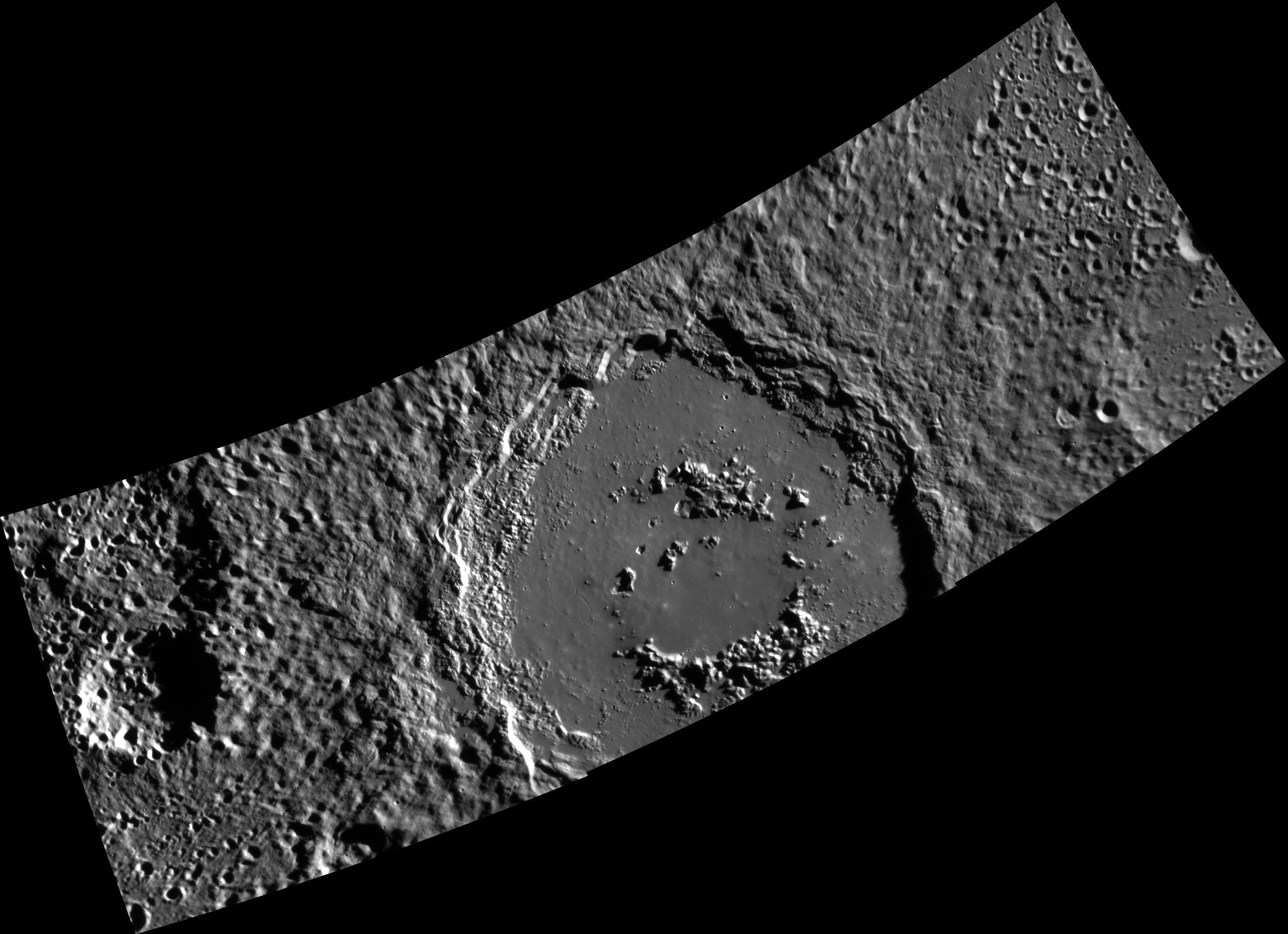 Alver is a large, peak-ring basin in Mercury's southern hemisphere. This mosaic, made up of three separate images, reveals a rough ejecta deposit, impact melt ponds, deposit, a smooth, cracked floor, terraced walls, and a peak ring. Give it a click and zoom in to see this basin in detail!