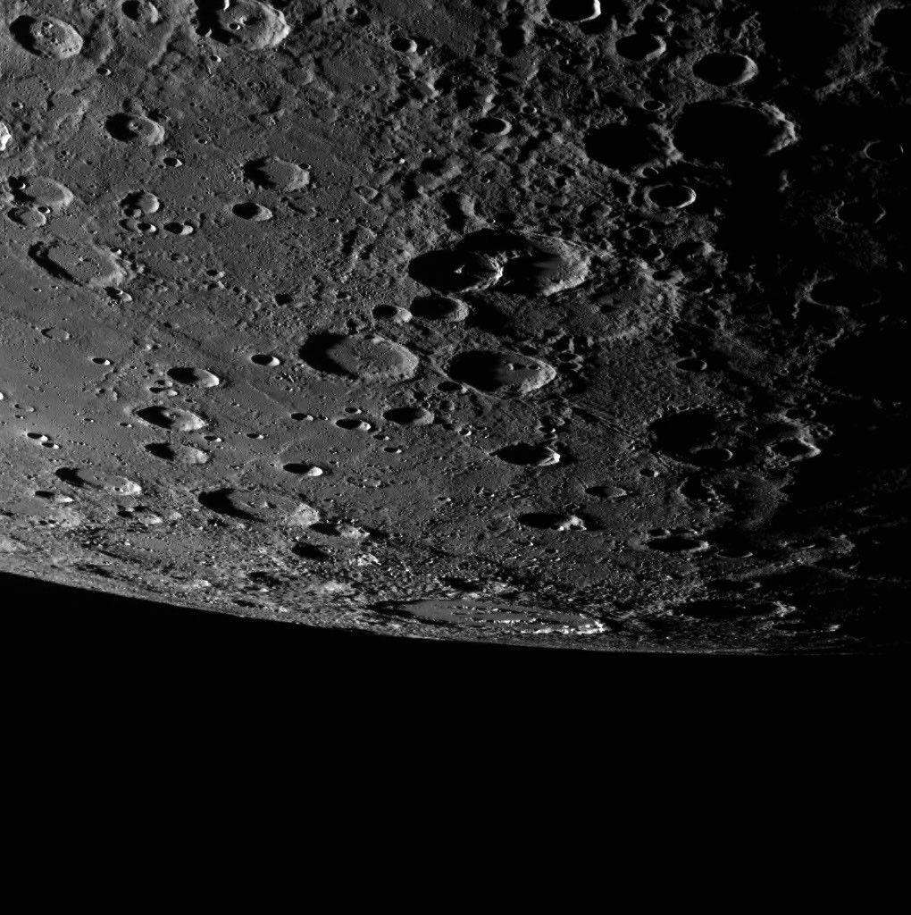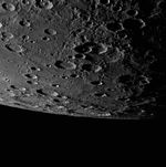 Alver crater again graces this image of Mercury's limb, this time seen just on the horizon. Secondary crater chains that scour the surface and lead toward the top right of the scene appear to be from the Rembrandt basin to the north.