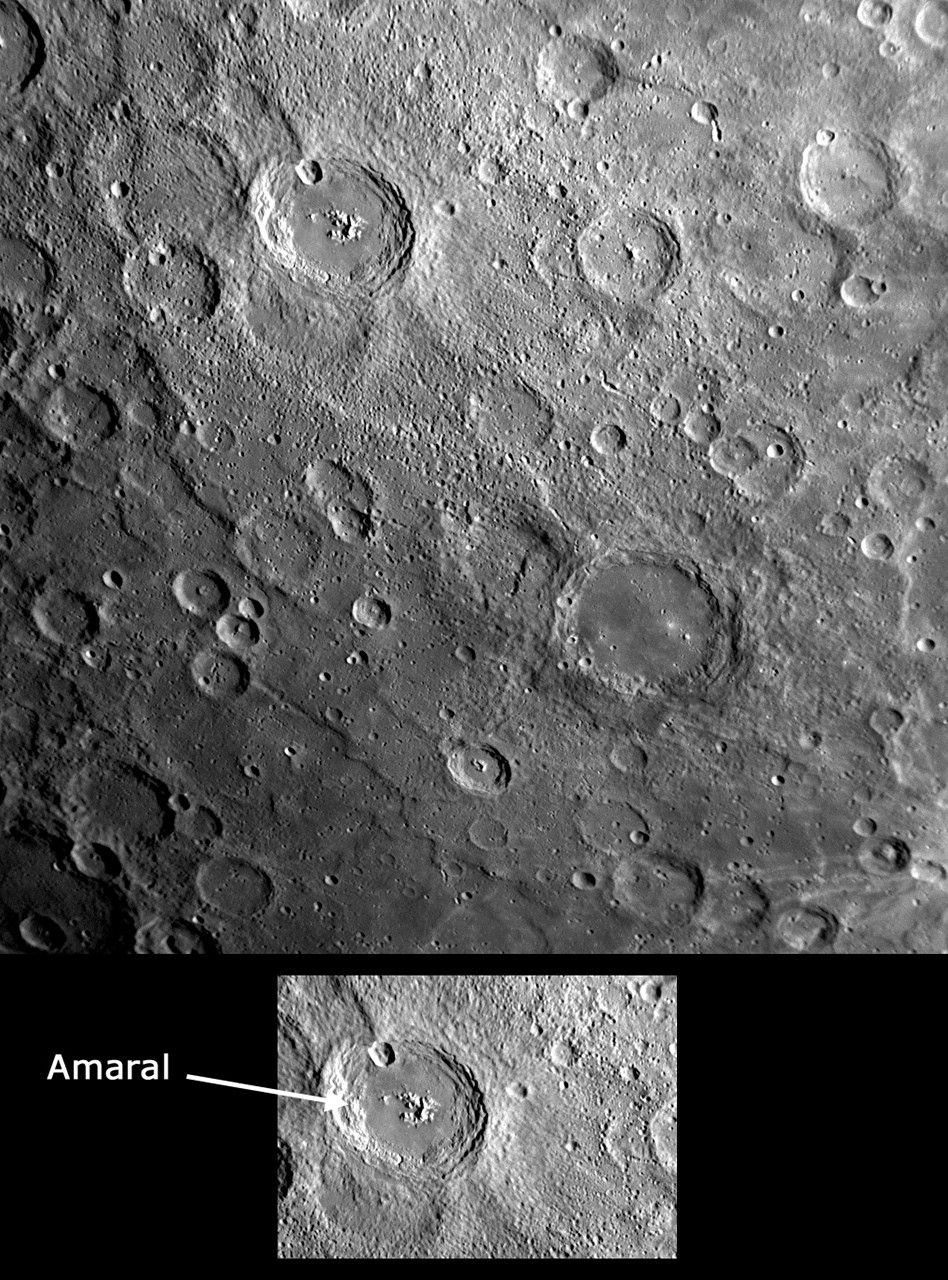 Near the top center of this image is the crater Amaral, recently named for the Brazilian modernist painter Tarsila do Amaral, who lived from 1886 to 1973 (see PIA11762). Amaral crater, with its smooth floor, surrounding ejecta, and small secondary craters, appears noticeably younger than the heavily cratered surface around it. Along with a smooth crater floor, Amaral also has a central peak. Bright material on this peak is of particular interest to members of the MESSENGER Science Team, as it appears to have an unusual color in images acquired in the 11 color filters of the Wide Angle Camera (WAC). In this previously released enhanced color image of Mercury (see PIA11219), the central peak of Amaral (just below center left) appears as a bright blue color in striking contrast to the otherwise orange tones of surface material nearby. The different color of the central peak likely indicates rocks with different chemical composition from those on the neighboring surface.