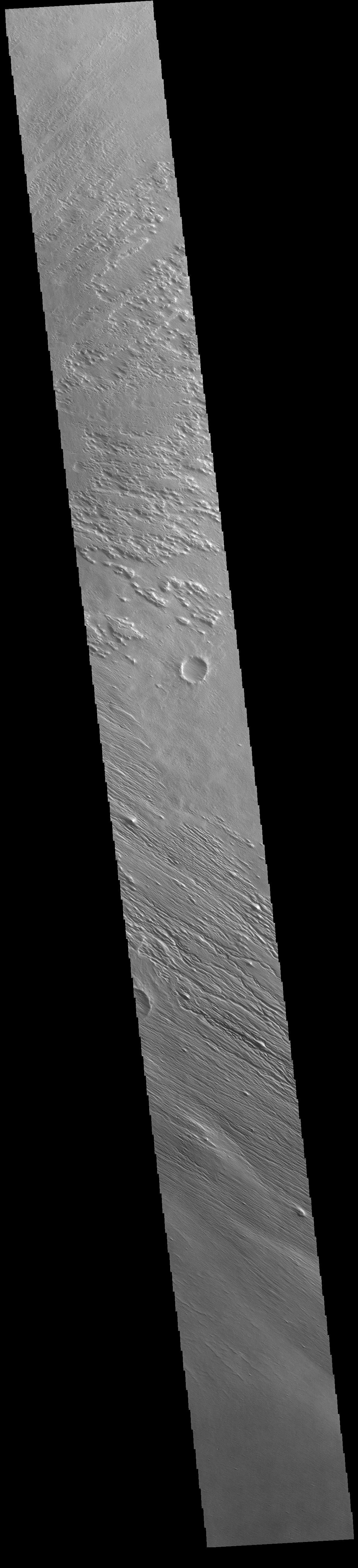 Today's VIS image shows part of the wind eroded Amazonis Mensa. Just one of several large linear mounds of material, Amazonis Mensa has been carved by long term surface winds. The linear grooves are aligned with the prevailing winds. The mensa has to be formed of soft, relatively uncemented materials to be eroded so easily. It has been suggested that the surface material may be volcanic ash from nearby volcanoes.