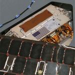 Nestled atop an electronics module on a lander side petal of the Mars Exploration Rover Spirit, a miniature American flag accompanies a patch bearing the names and signatures of U.S. officials including President George W. Bush and NASA Administrator Sean O'Keefe. This image was taken on Mars by the rover's panoramic camera.