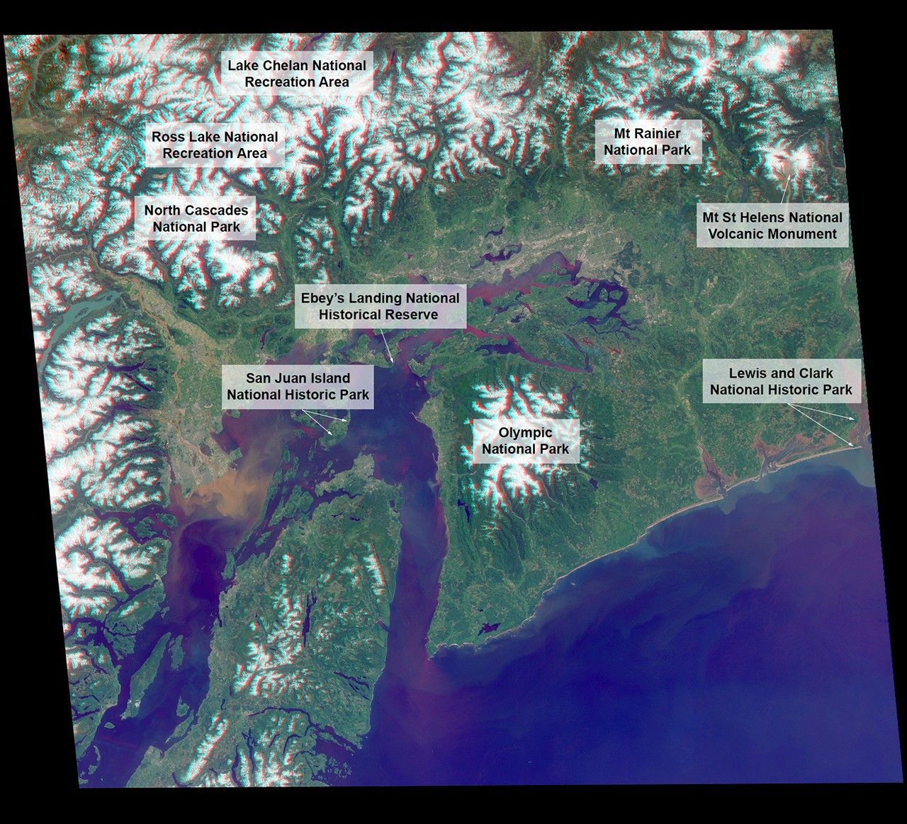 Shown in the annotated image are Lewis and Clark National Historic Park, Mt. Rainier National Park, Olympic National Park, Ebey's Landing National Historical Reserve, San Juan Island National Historic Park, North Cascades National Park, Lake Chelan National Recreation Area, and Ross Lake National Recreation Area (also Mt. St. Helens National Volcanic Monument, administered by the U.S. Forest Service)