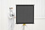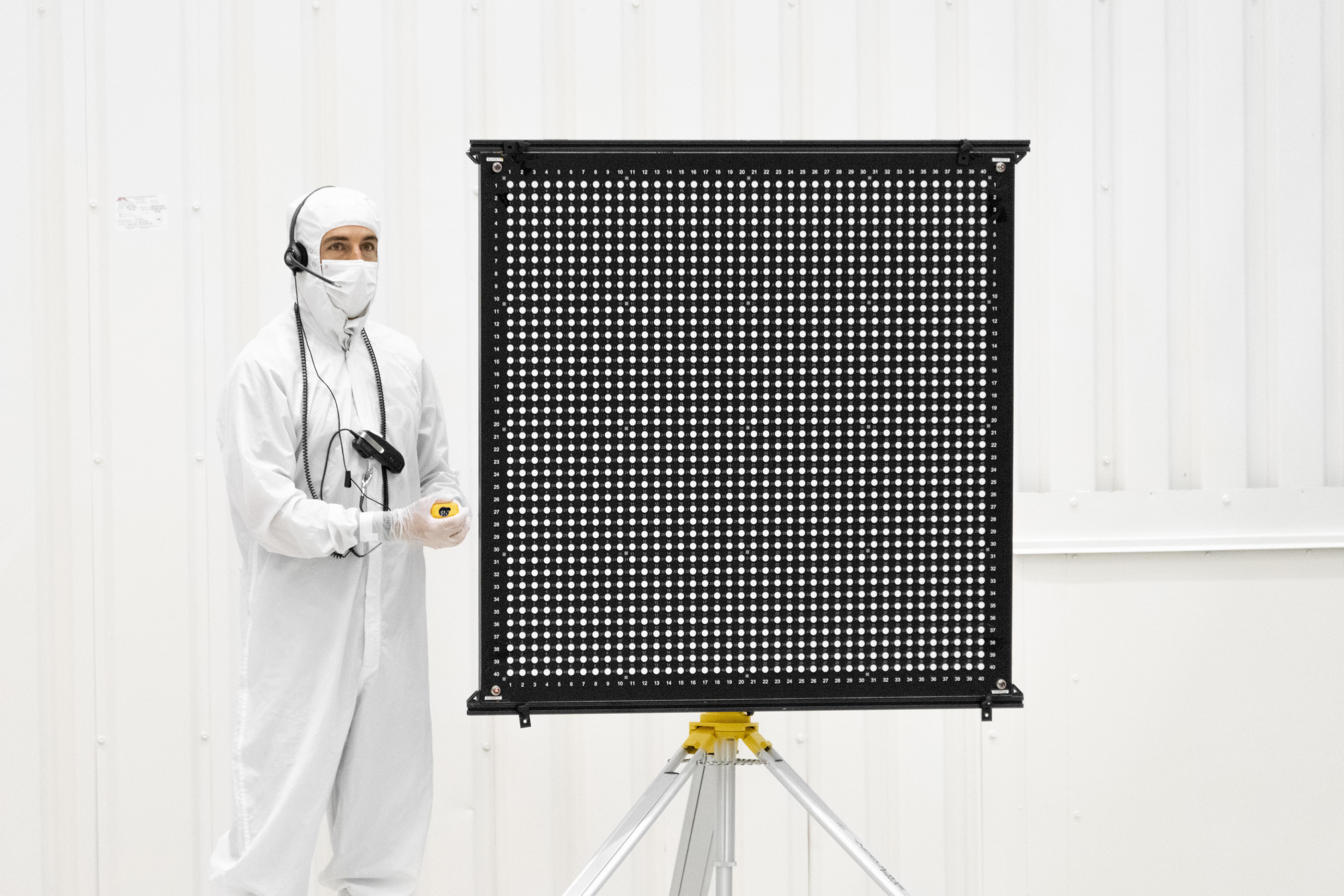 Engineer Chris Chatellier stands next to a target board with 1,600 dots. The board was one of several used on July 23, 2019, in the Spacecraft Assembly Facility's High Bay 1 at NASA's Jet Propulsion Laboratory in Pasadena, California, to calibrate the forward-facing cameras on the Mars 2020 rover.