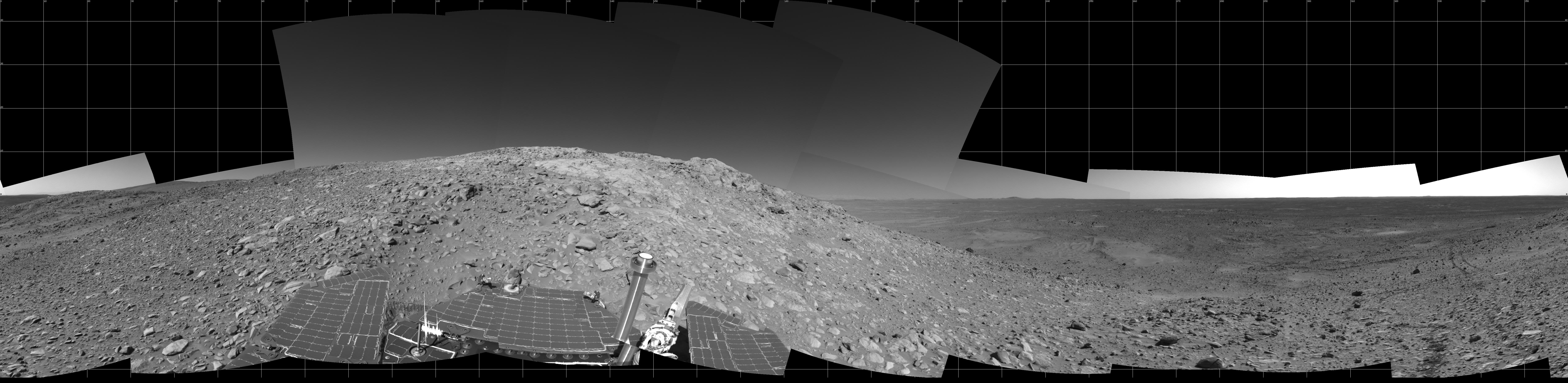 NASA's Mars Exploration Rover Spirit created this 360-degree view of the rolling martian terrain at "Columbia Hills" on sol 204 (July 30, 2004), after traveling more than 3 kilometers (2 miles) across the plains of the 165-kilometer-wide (103-mile-wide) Gusev Crater. This mosaic was created from images taken by Spirit's navigation camera. The view is presented in a cylindrical projection with geometrical seam correction.