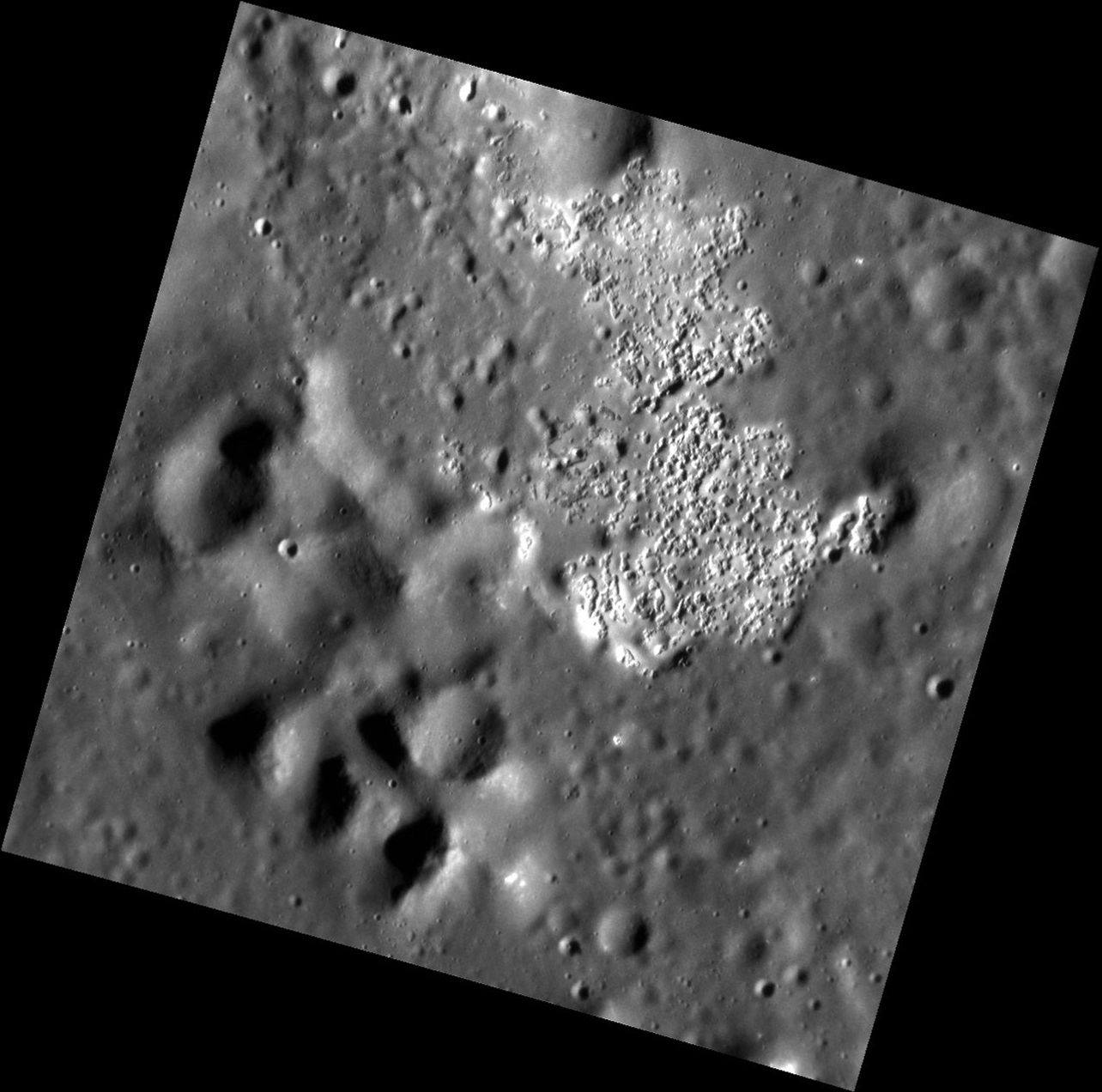 The image above shows an area within an unnamed basin that has been etched by hollows. This is the only area within the basin in which hollows are found. To the bottom left, part of the peak ring of the basin can be seen. This peak ring has been modified by subsequent impacts.