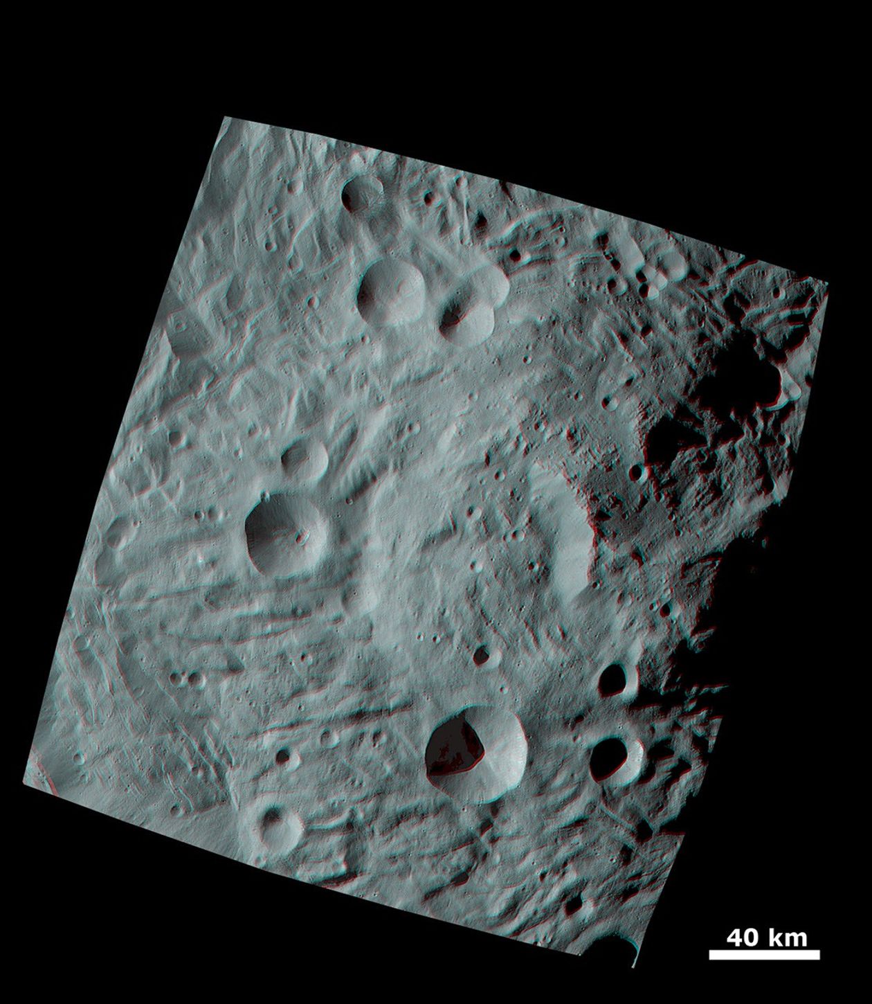 The framing camera (FC) instrument aboard NASA's Dawn spacecraft obtained the images used to make this anaglyph on 17th and 20th August 2011. The distance from Dawn to the surface of Vesta was 2740km at this time. The image has a resolution of about 260 meters per pixel.