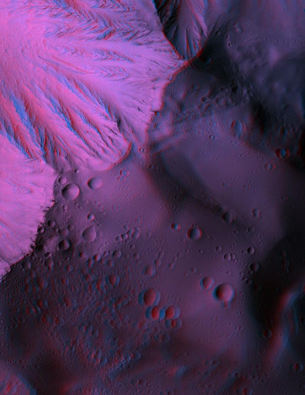 By combining two HiRISE observations (PSP_001432_2015 and PSP_001630_2015), we can see an approximately 6 km (3.7 mile) wide portion of this scarp in three dimensions. The topography can be seen in this anaglyph by using red-blue glasses. The rugged topography at the edge of the scarp, with kilometer-scale pieces of the volcano pushed up or pulled apart, fits the idea that the lower part of Olympus Mons is riddled with faults.