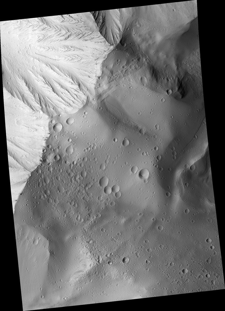 Image PSP_001630_2015 was taken by the High Resolution Imaging Science Experiment (HiRISE) camera onboard the Mars Reconnaissance Orbiter spacecraft on 01-Dec-2006. The complete image is centered at 21.5 degrees latitude, 222.4 degrees East longitude. The range to the target site was 289.6 km (181.0 miles). At this distance the image scale is 29.0 cm/pixel (with 1 x 1 binning) so objects ~87 cm across are resolved. The image shown here has been map-projected to 25 cm/pixel and north is up. The image was taken at a local Mars time of 03:35 PM and the scene is illuminated from the west with a solar incidence angle of 52 degrees, thus the sun was about 38 degrees above the horizon. At a solar longitude of 143.7 degrees, the season on Mars is Northern Summer.