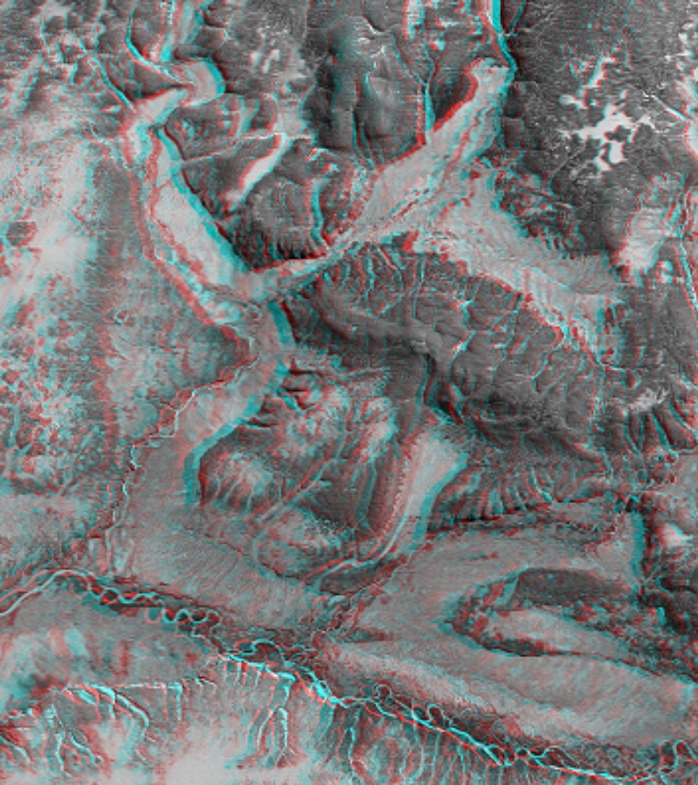 This anaglyph was generated using topographic data from the Shuttle Radar Topography Mission to create two differing perspectives of a single image, one perspective for each eye. Each point in the image is shifted slightly, depending on its elevation. When viewed through special glasses, the result is a vertically exaggerated view of the Earth's surface in its full three dimensions. Anaglyph glasses cover the left eye with a red filter and cover the right eye with a blue filter. The United States Geological Survey's Earth Resources Observations Systems (EROS) Data Center, Sioux Falls, South Dakota, provided the Landsat data, which are overlain on the topography.