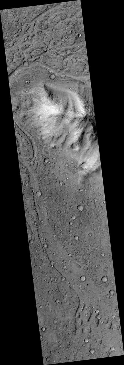 This image shows the northern terminus of an outflow channel located in the volcanic terrains of Amenthes Planum.
