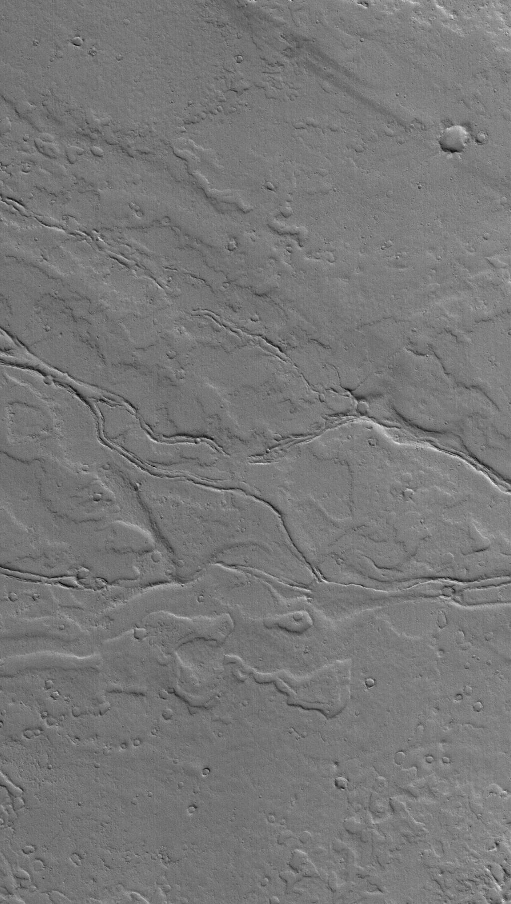 This Mars Global Surveyor (MGS) Mars Orbiter Camera (MOC) image shows ancient, dust-covered lava flows and remains of leveed lava channels located on a plain northwest of Jovis Tholus. Jovis is a relatively small volcano in the Tharsis region of Mars.