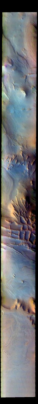 The THEMIS VIS camera contains 5 filters. The data from different filters can be combined in multiple ways to create a false color image. These false color images may reveal subtle variations of the surface not easily identified in a single band image. Today's false color image shows part of Angustus Labyrinthus. Angustus Labyrinthus is a unique region near the south polar cap. In the center of this image squares formed by intersecting ridges are visible. The feature earned the informal name of the Inca City when it was discovered in Mariner 9 images in 1972.The linear ridges are believed to have formed by volcanic and tectonic forces, where magma filled fractures in the subsurface and then erosion revealed the magmatic material.