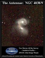 Atlas Image mosaic, covering 7´ × 7´ on the sky of the interacting galaxies NGC 4038 and NGC 4039, better known as the Antennae, or Ring Tail galaxies. The two galaxies are engaged in a tug-of-war as they collide. The mutual gravitation between them is working to distort each spiral galaxy's appearance as the two merge. The interaction is evidently impetus for an intense burst of new star formation, as can be seen from the many infrared-bright knots and bright galactic nuclei. Compare the 2MASS view of this system with that obtained by the Hubble Space Telescope in the optical. Many of the same features are seen, although 2MASS is able to peer through much of the dust seen in the galaxies' disks. The galaxy light looks smoother. Also, in the near-infrared the bright knots of star formation are likely highlighted by the light of massive red supergiant stars. The much more extended "tidal tails," which give the Antennae their name, are quite faint in the 2MASS image mosaic.