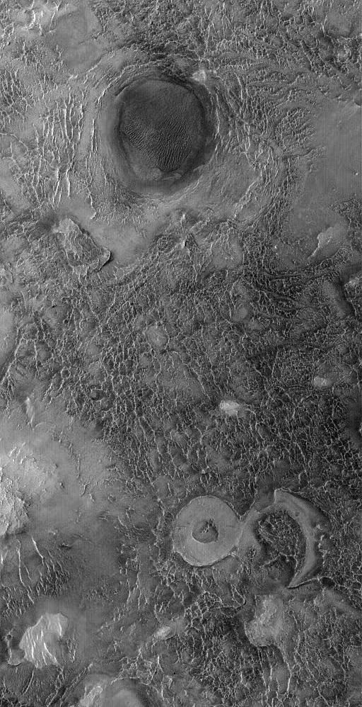 This Mars Global Surveyor (MGS) Orbiter Camera (MOC) image shows landforms on the floor of Antoniadi Crater. The circular features were once meteor impact craters that have been almost completely eroded away.