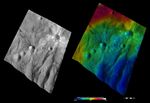 The left-hand image is a Dawn FC (framing camera) image, which shows the apparent brightness of Vesta's surface. The right-hand image is based on this apparent brightness image, which has had a color-coded height representation of the topography overlain onto it. The topography is calculated from a set of images that were observed from different viewing directions, which allows stereo reconstruction. The various colors correspond to the height of the area. The white and red areas in the topography image are the highest areas and the blue areas are the lowest areas. Canuleia is the large crater in the top right of the images and Sossia crater is the large crater offset to the left of the center of the images. In the apparent brightness image it is clear that rays of bright material surround Canuleia. There is also one band of dark material on Canuleia's left side. Sossia has rays of dark material originating from it, mostly on its left side. The topography image shows that both craters have a bowl-like shape and that Canuleia's dark band runs along a topographically low area (colored blue).