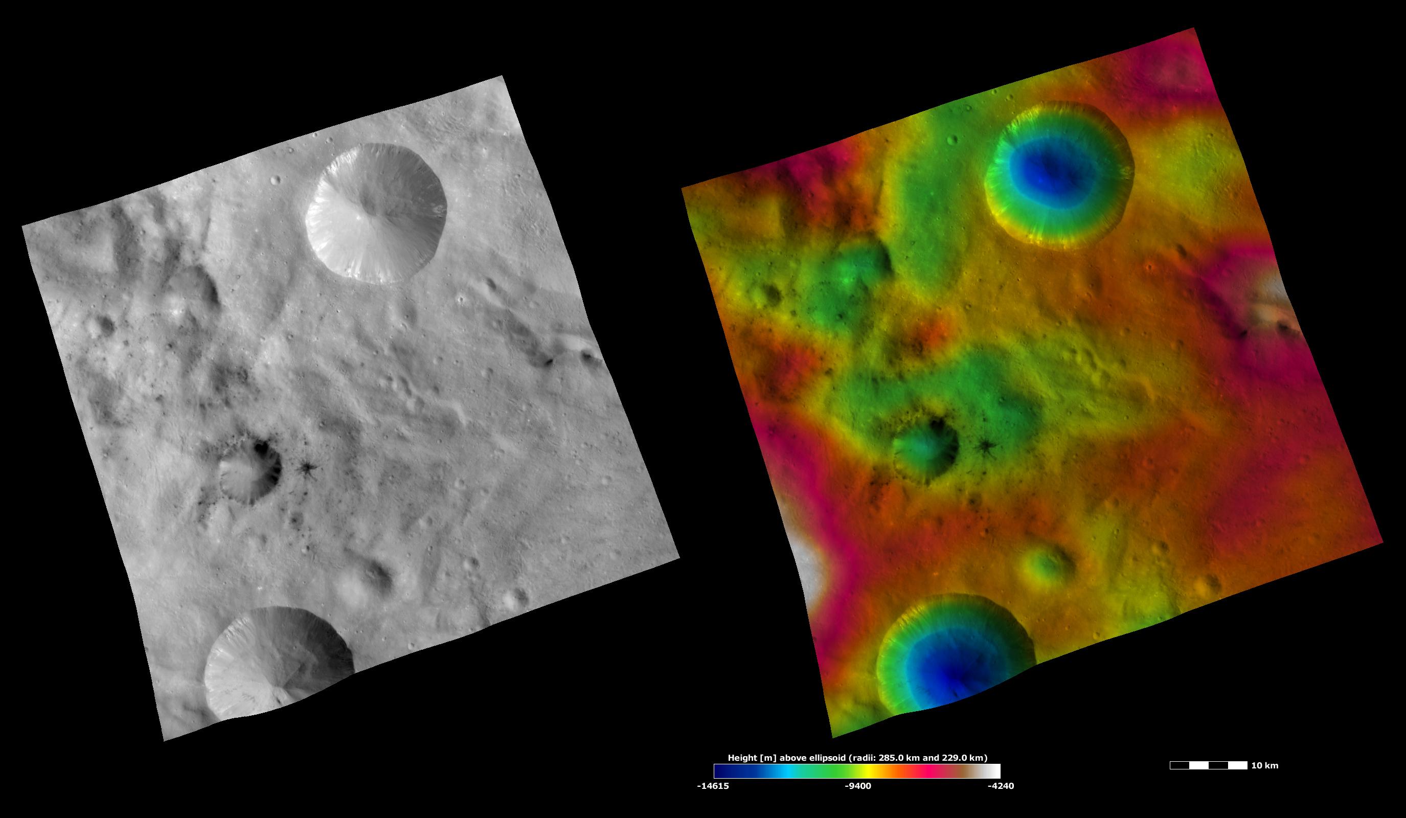 The left-hand image is a Dawn FC (framing camera) image, which shows the apparent brightness of Vesta's surface. The right-hand image is based on this apparent brightness image, which has had a color-coded height representation of the topography overlain onto it. The topography is calculated from a set of images that were observed from different viewing directions, which allows stereo reconstruction. The various colors correspond to the height of the area. The white and red areas in the topography image are the highest areas and the blue areas are the lowest areas. Laelia crater is the crater surrounded by dark material offset to the left of the center of the image. Sextilia crater is the large crater in the top of the images with bright material around its rim. In the apparent brightness image it is clear that some of the dark material associated with Laelia crater crops out from its rim and slumps towards its center and that some has been excavated by smaller craters surrounding Laelia. The bowl shape of Sextilia crater is seen in the topography image.
