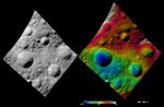 The left-hand image is a Dawn FC (framing camera) image, which shows the apparent brightness of Vesta's surface. The right-hand image is based on this apparent brightness image, which has had a color-coded height representation of the topography overlain onto it. The topography is calculated from a set of images that were observed from different viewing directions, which allows stereo reconstruction. The various colors correspond to the height of the area. The white and red areas in the topography image are the highest areas and the blue areas are the lowest areas. Publicia crater is the large, sharp rimmed crater in the bottom right of the image. Publicia is bowl shaped, which can be seen in the topography image. There is a large mound of material in the center of the crater. This material was probably deposited here after Vesta's gravity caused it to slump down the crater walls to the center, which is the crater's lowest point. A number of small impact craters have formed on this material. The apparent brightness image shows that there is a fine-scale intermingling of bright and dark material around the rim of Publicia crater.