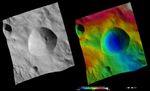 The left-hand image is a Dawn FC (framing camera) image, which shows the apparent brightness of Vesta's surface. The right-hand image is based on this apparent brightness image, which has had a color-coded height representation of the topography overlain onto it. The topography is calculated from a set of images that were observed from different viewing directions, which allows stereo reconstruction. The various colors correspond to the height of the area. The white and red areas in the topography image are the highest areas and the blue areas are the lowest areas. These images are centered on the large Tarpeia crater. The topography image shows that Tarpeia crater formed in a region of lower topography (mostly colored green) relative to the surrounding higher topography (colored red and white). The topography image also shows that the base of Tarpeia crater (colored dark blue) is roughly circular.