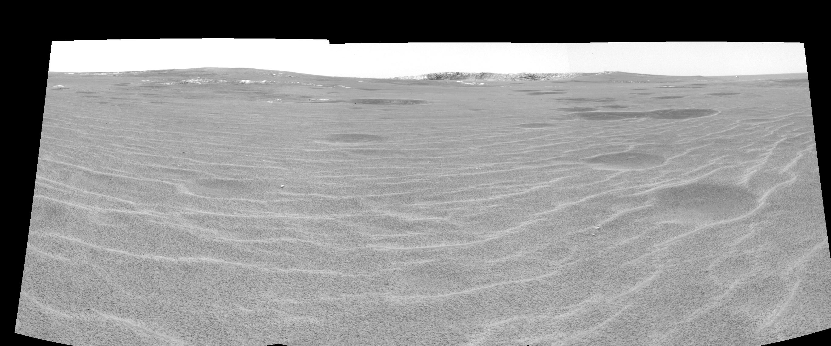 This cylindrical-perspective projection was constructed from a sequence of images taken by the Mars Exploration Rover Opportunity's navigation camera on the rover's 93rd sol on Mars. The mosaic was created from three images from the camera's right eye. The camera acquired the images at approximately 12:27 Local Solar Time, or around 8:22 AM Pacific Daylight Time on April 28, 2004. On that sol, Opportunity sat about 75 meters (246 feet) away from the rim of "Endurance Crater."